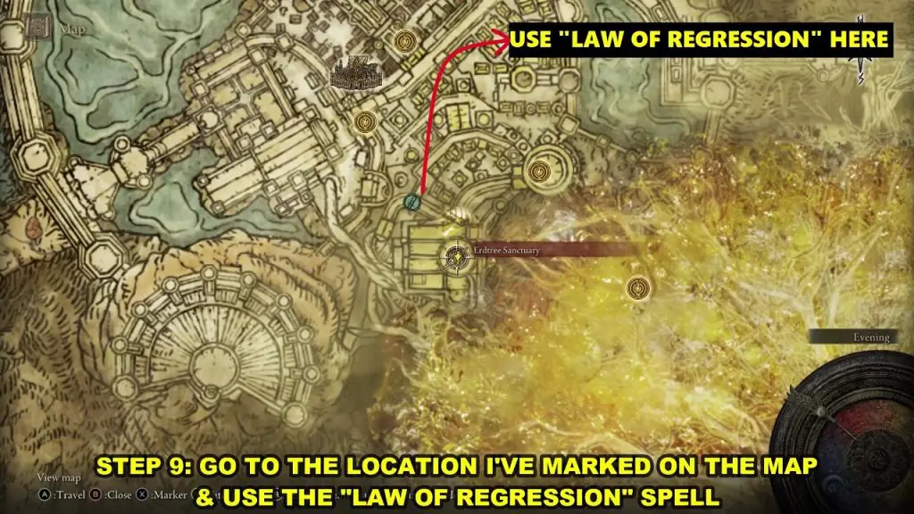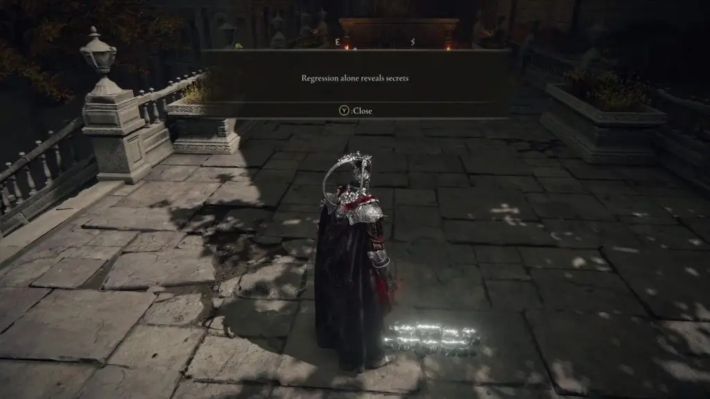 From the Erdtree Sanctuary Site of Grace, go out from the door on the west side. Then turn right and take the elevator down. When the elevator stops, follow the steps down and you will reach the marked location. Here you will find a message “Regression alone reveals secrets. Use the Law of Regression Spell on this spot.