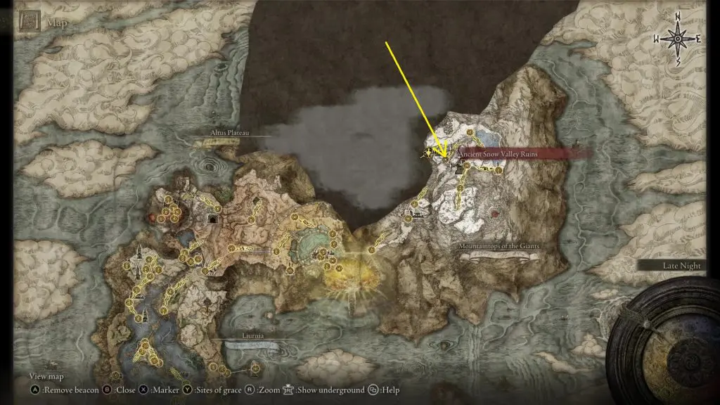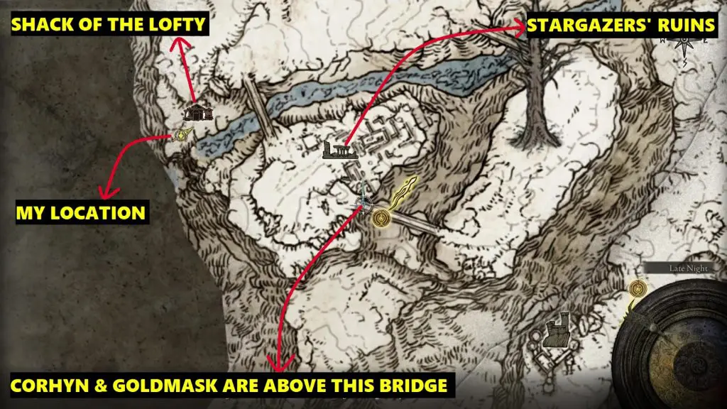 From the Ancient Snow Valley Ruins Site of Grace, take the path going northeast until you reach the river. Then follow the river towards the west to reach the Shack of the Lofty.