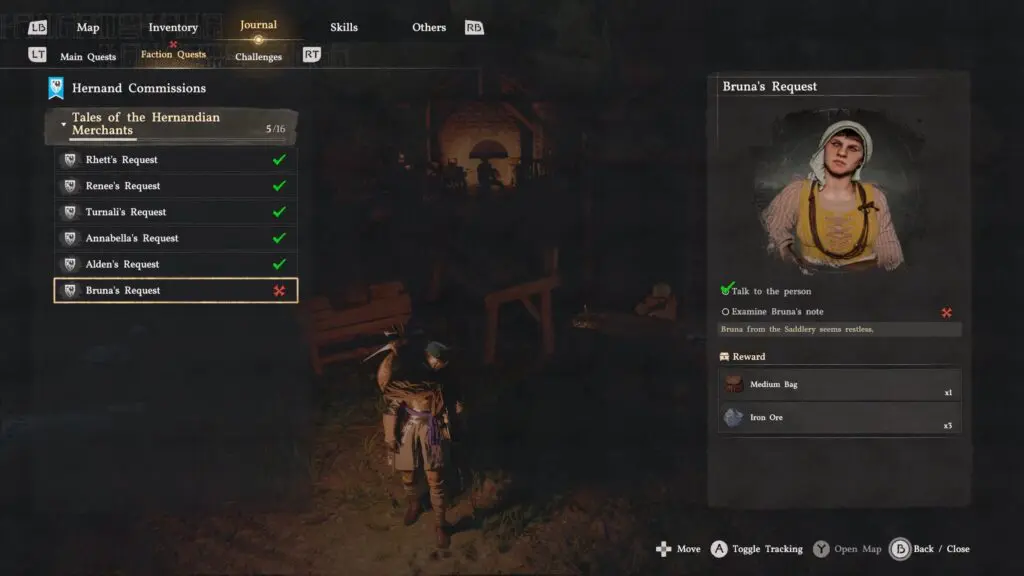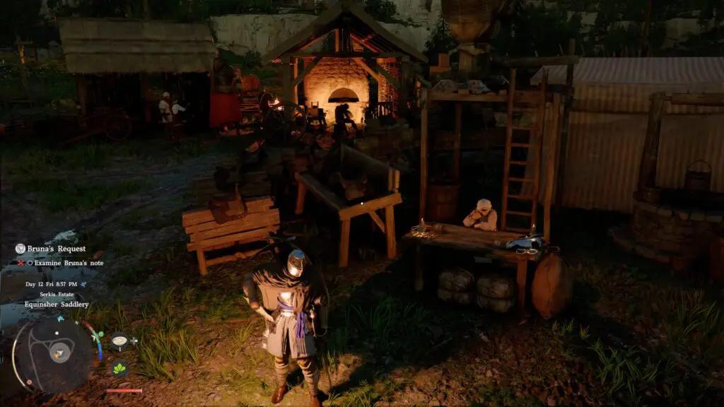 After speaking with Bruna, open your inventory and read Bruna’s note to learn that the saddler works at Hernand Stable.