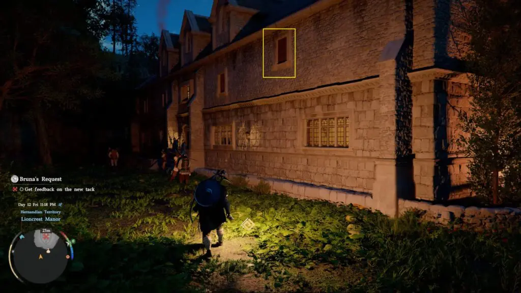 Head to Lioncrest Manor, where you’ll find guards blocking the front door. Instead of trying to go in directly, move around to the back of the building and look for a small window just to the right of the back door.