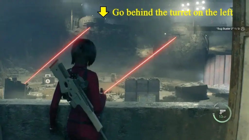 For the next two bugs, evade the initial set of turrets positioned in front of you. Grapple your way on the right and then follow the path to go behind the turrets on the left as shown in the image below.