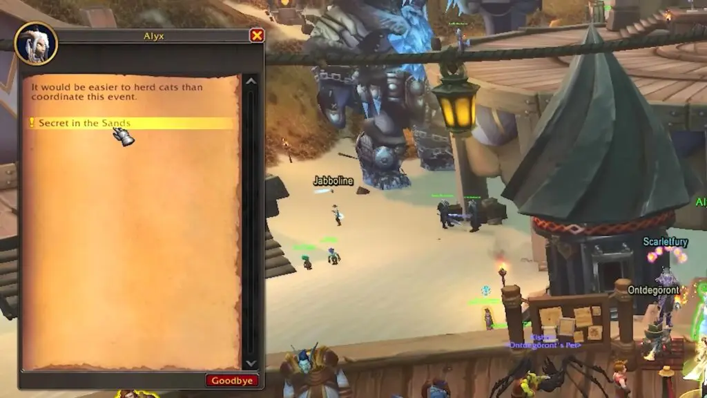 Speak with Alyx at the main tent of the Caverns of Time to start the quest – Secret in the Sands. She is wearing a white dress and is the Volunteer Assistant Guest Relations Manager.