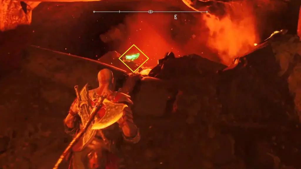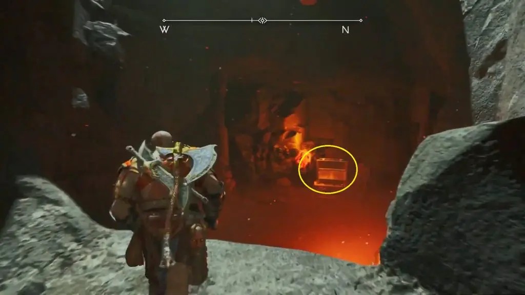 Continue walking a little bit downhill to find a yellow-glowing rock on the right. Throw the spear at it to blow up. You will find the Nornir Chest behind it.