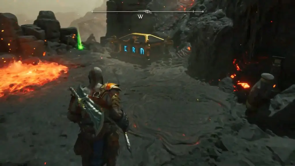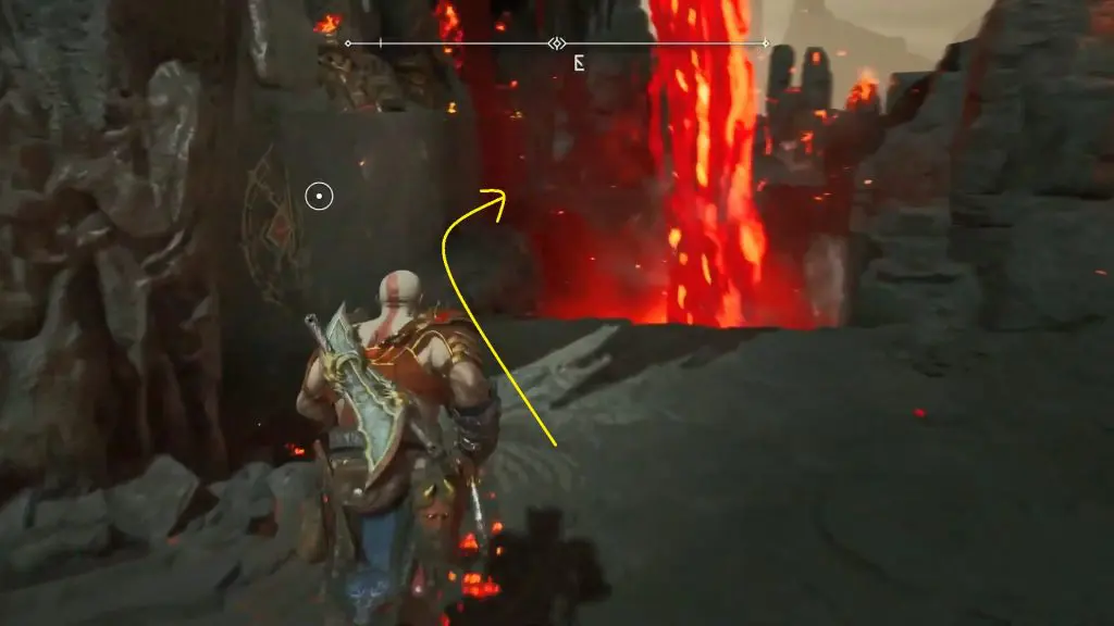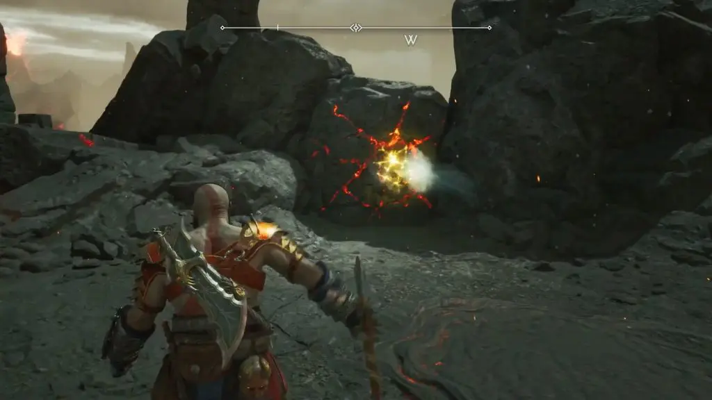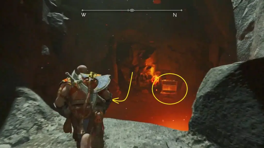 Continue walking a little bit downhill to find a yellow-glowing rock on the right. Throw the spear at it to blow up. You will find the Nornir Chest behind it.