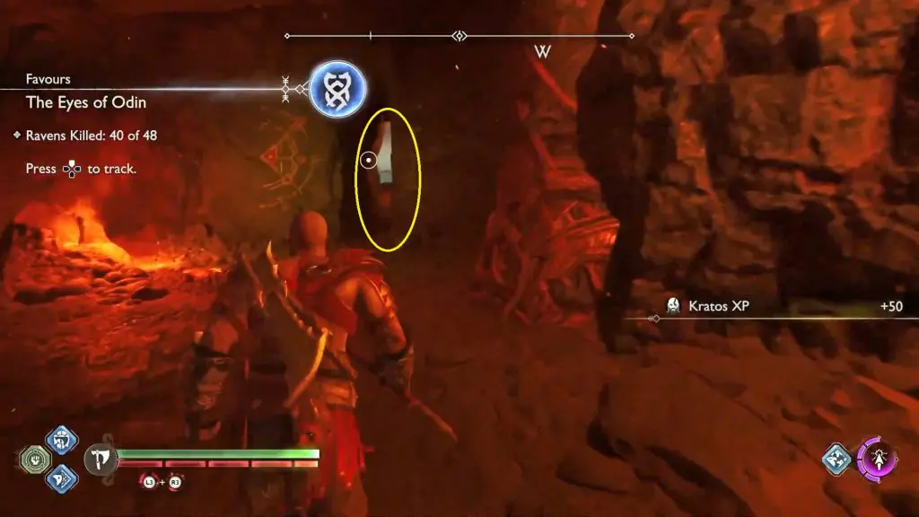 Head to the Mystic Gateway of Burning Cliffs area as shown on the map. Go down the cliff and to the right to enter a cave. This is the only linear path available here. Here you will find a Legendary Chest and an Odin’s Raven