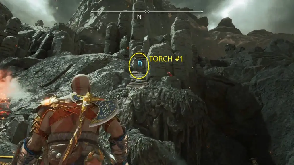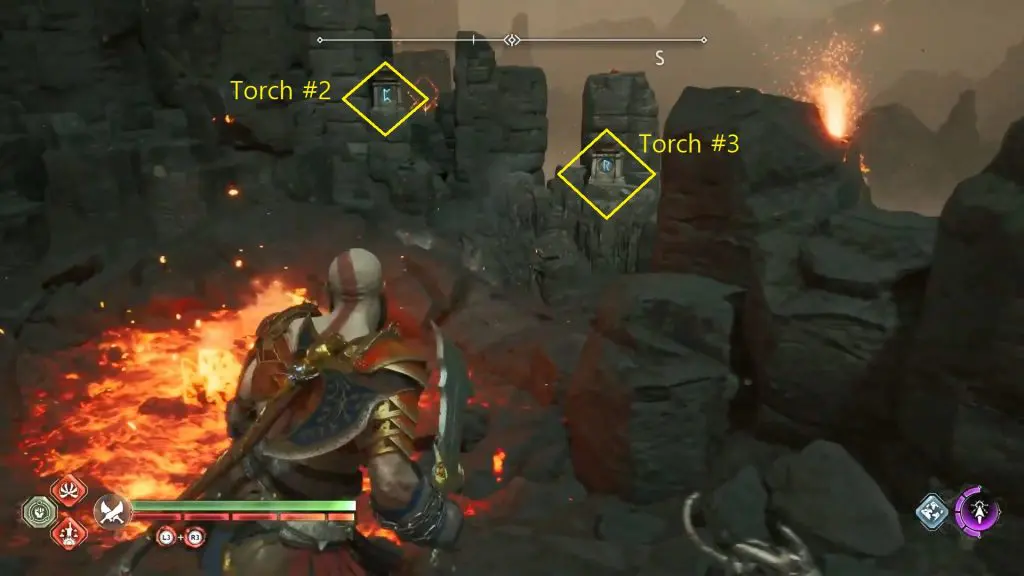 Go back to Nornir Chest and turn around to see Torch #3 near Torch #2. Shot three purple arrows on the wall near Torch #3. Light the nearest purple circle with the Chaos Blades to cause a chain reaction that will light torch #3.
