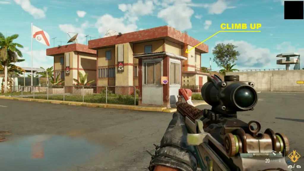 After reading the note, climb up the building behind it using the ladder as shown below.
