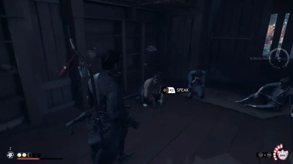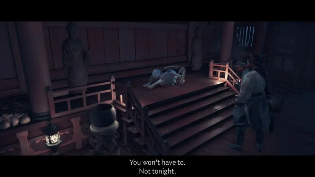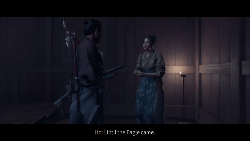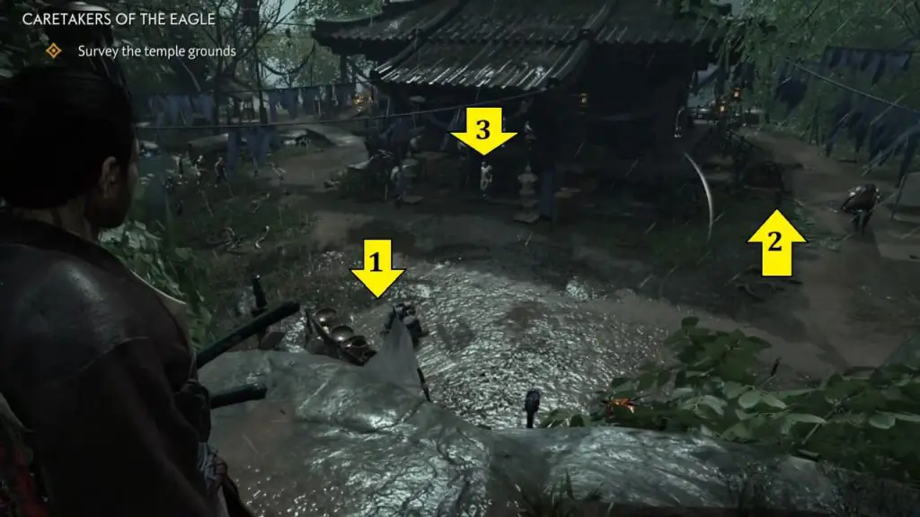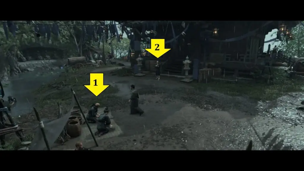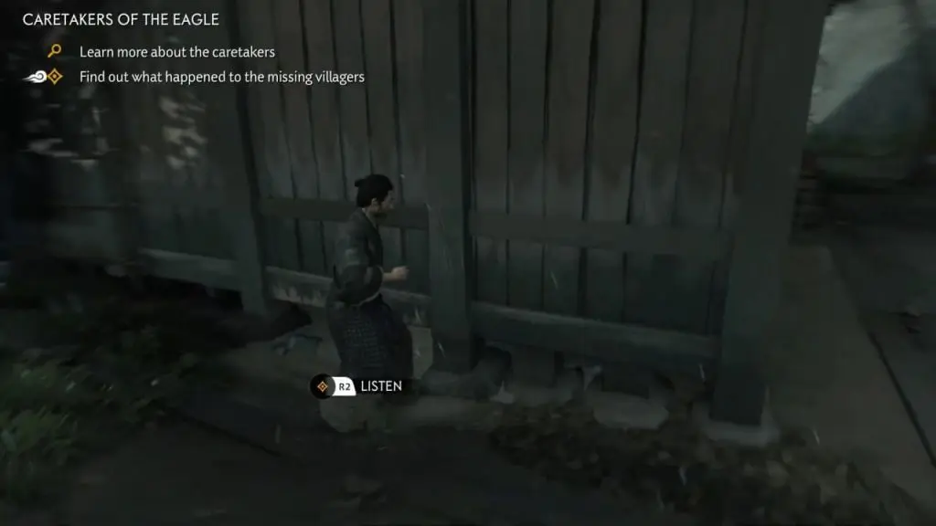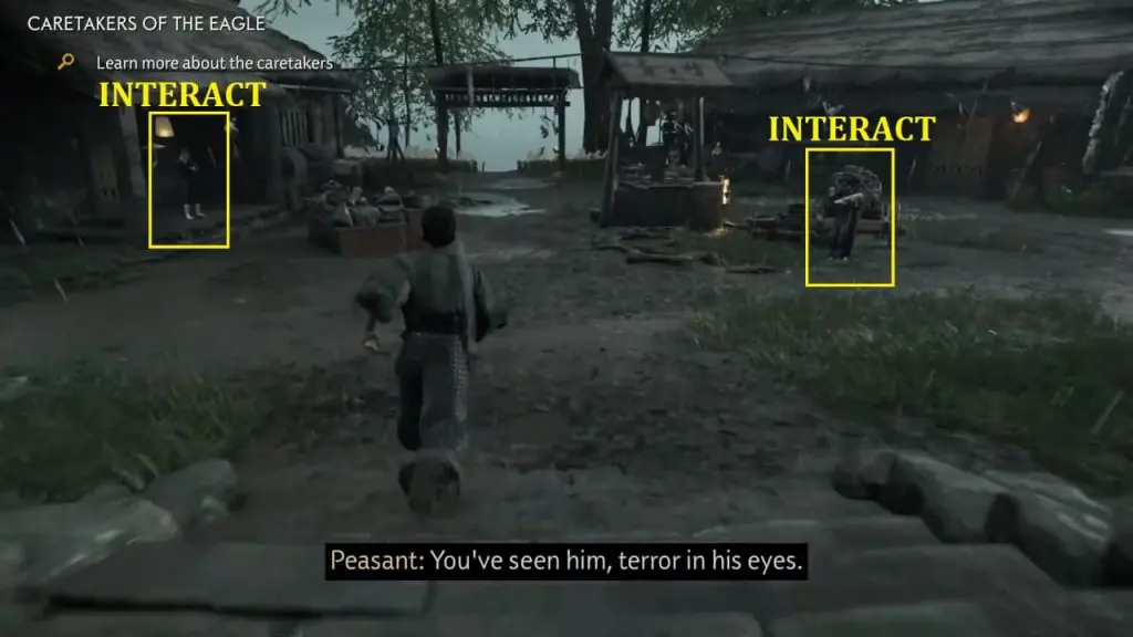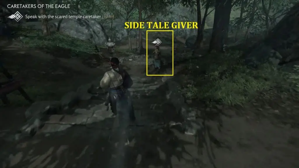 As the tale start, your first objective will be to find and talk to a scared temple caretaker (NPC name Ito). She will tell you that the Monk Zenshin’s caretaker has imprisoned her and others from the village (including her brother). Zenshin dupes these caretakers into serving the eagle tribes. She will direct you to a path where you can listen in on Zenshin’s conversation with his caretakers.