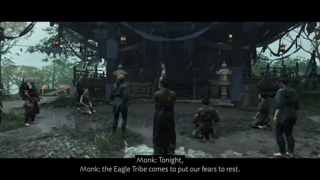 Following this, a cut scene will begin in which Monk Zenshin informs the caretaker that the Eagle tribes will arrive tonight and that they must prepare.