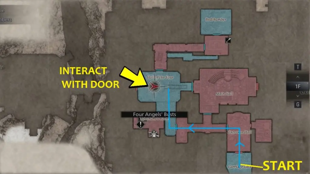 From Entrance Hall take the stairs and go through the door on the left side. Follow the hallway, down through the stairs, and cross the door on the right towards the Hall of the Four.