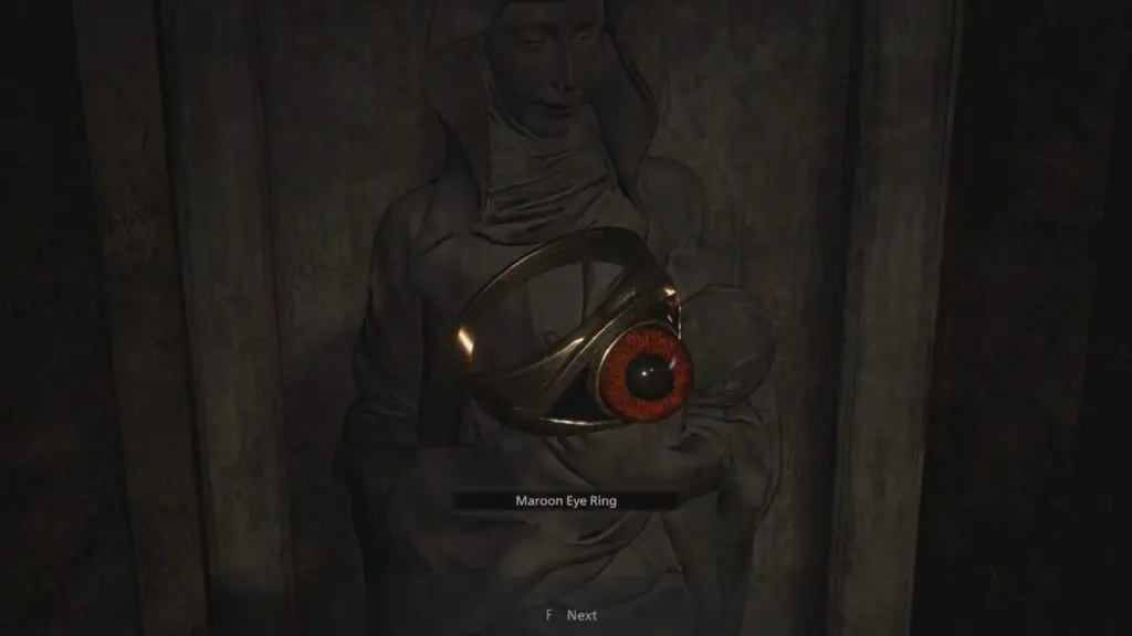 Take the Maroon Eye Ring from the statue to reveal a secret passage. Finally, take the door on the left to reach back to the castle halls.