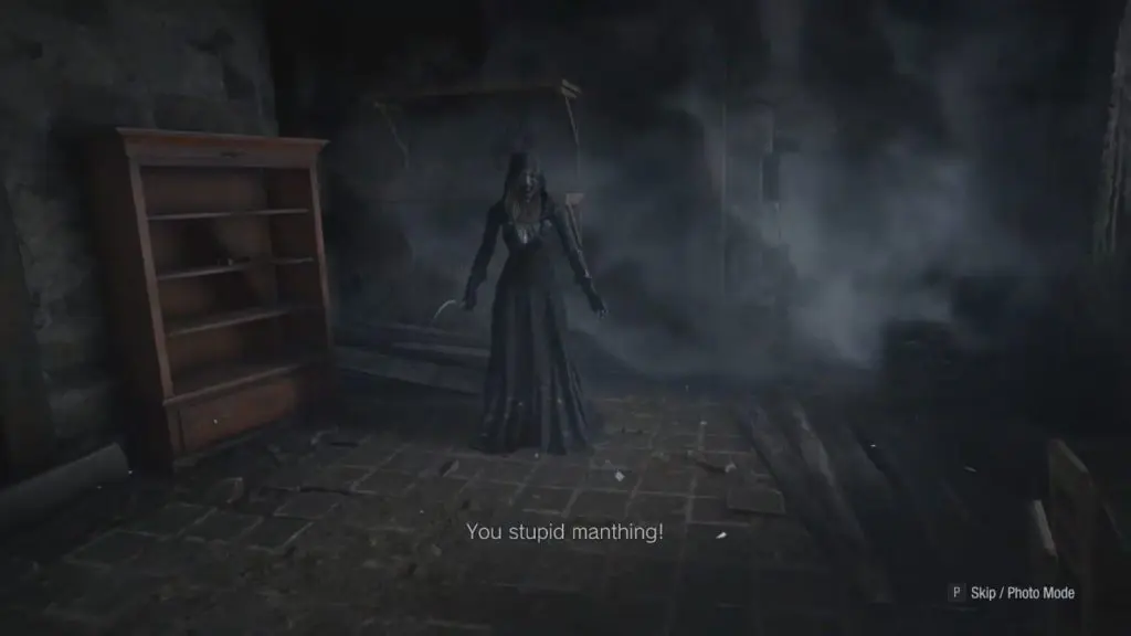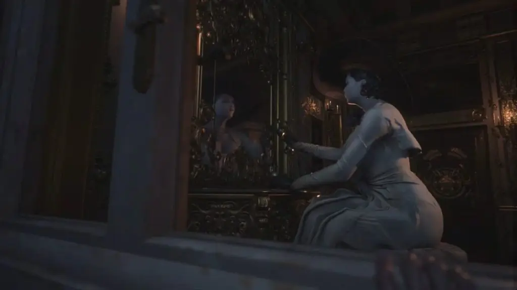 - At the door, you will encounter one of Lady Dimitrescu’s daughters. Find your way out through the ‘Dressing Room’ to reach the basement.