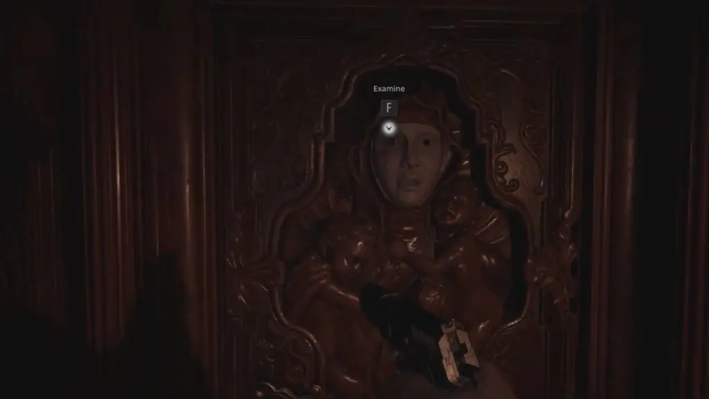 At the end of the staircase, use the Dimitrescu key to open the door. Take the Mask of Sorrow from the statue to activates the elevator.