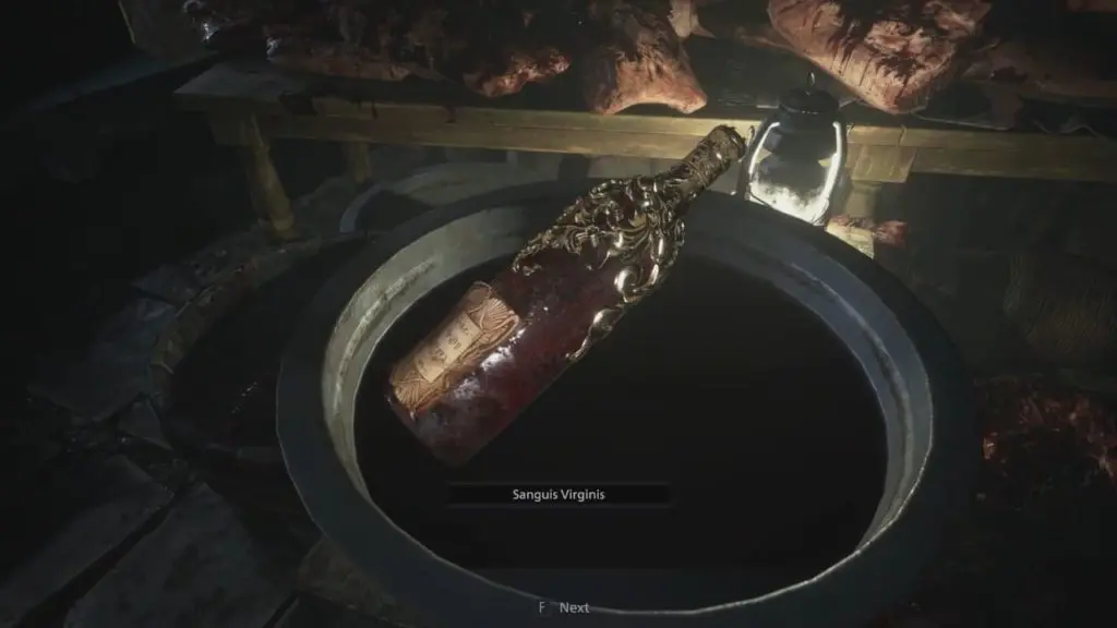 - A cut scene starts here in which a glass window gets shattered by your bullet. From here you can fight with Lady Dimitrescu’s daughters as the cold breeze expose her. After defeating her follow the hall into the Kitchen and grab Sanguis Virginis bottle out of the tub.