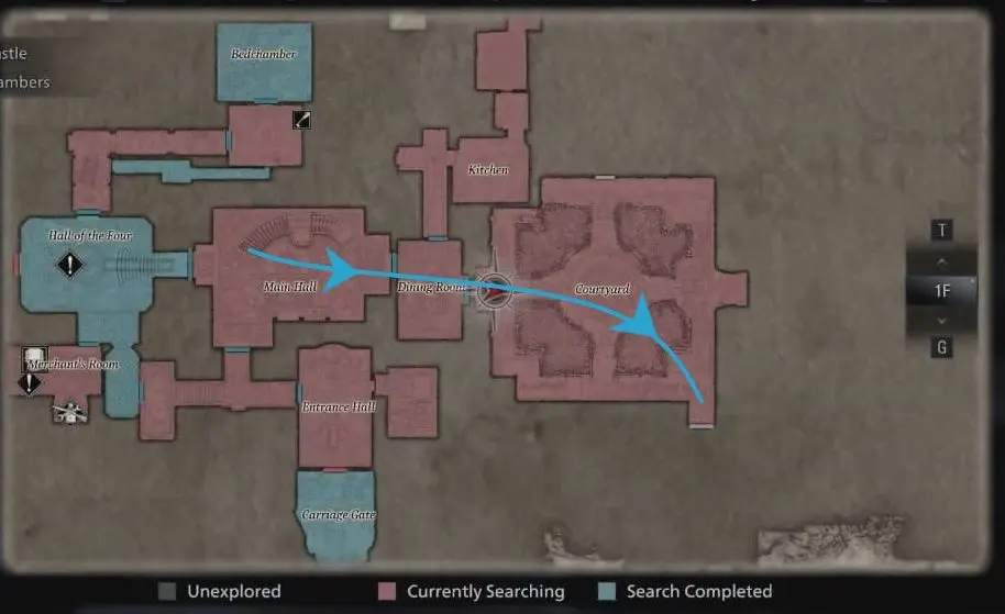 - Take the stairs and follow the hallway to find the Castle Map (Main), This will fill in the rest of your map. Go through the door in the “Hall of Ablution”.