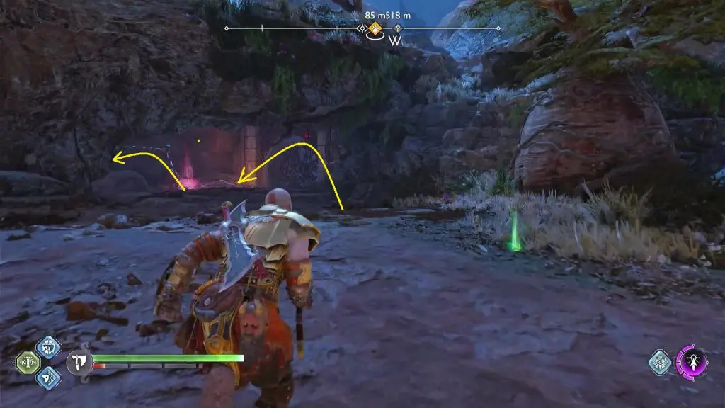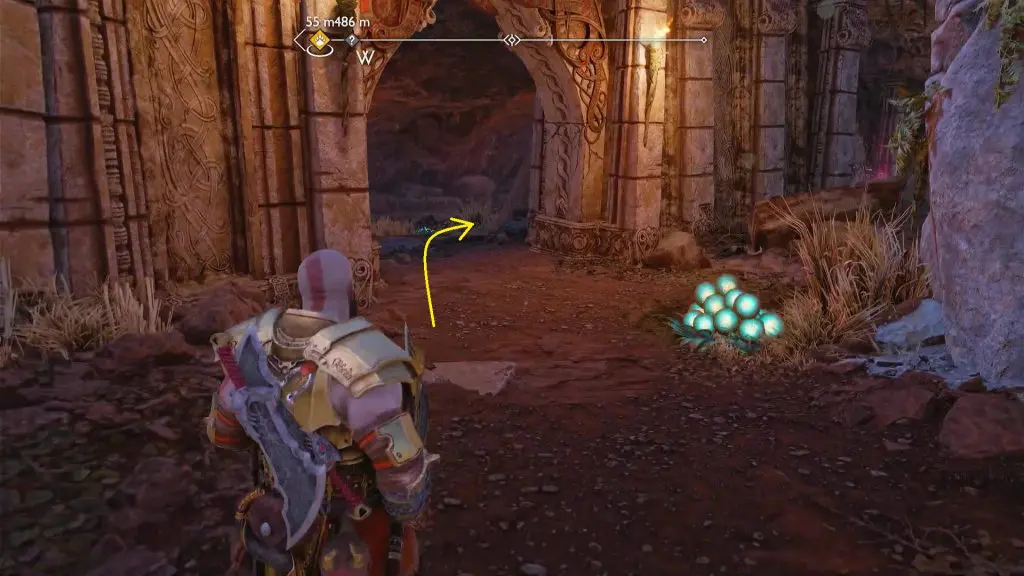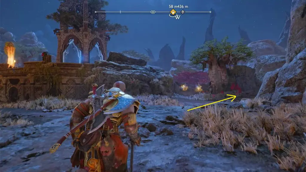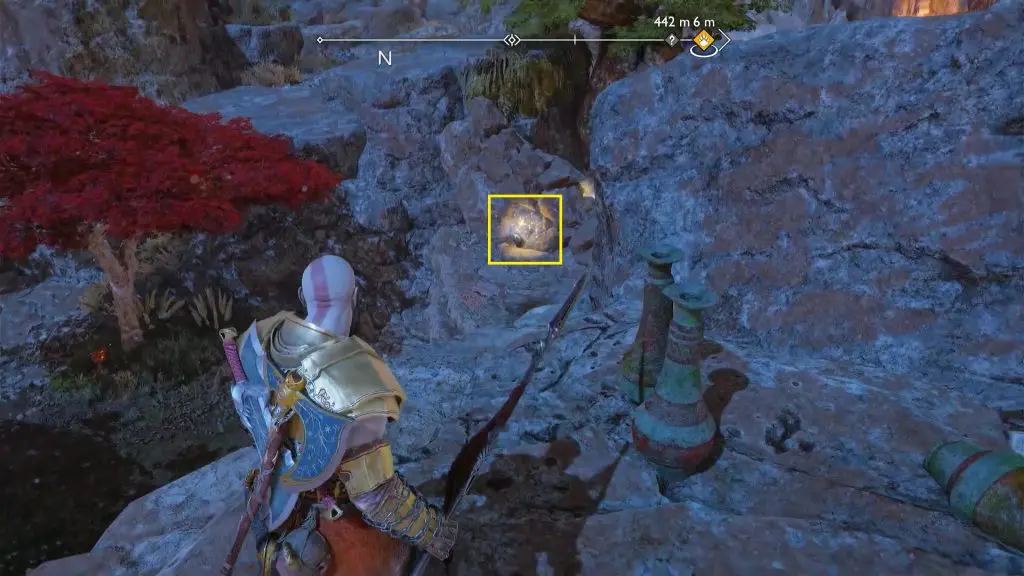 Go out of the cave and climb up the wall on the south side. Then continue ahead to reach the celestial altar. Go north from the altar and look down from the edge to see the scroll as shown in the picture below. Look on the right side of the scroll and you will see a glowing stone as shown in the second picture below. Hit it with a spear but don’t detonate it yet. Jump down the altar from the east side, and then turn left and go to the opposite side of the barrier that you just hit with a spear. You will see two other glowing stones there. Hit them with spears. Then detonate all the there spears to destroy the barrier. Then jump down to complete the quest.