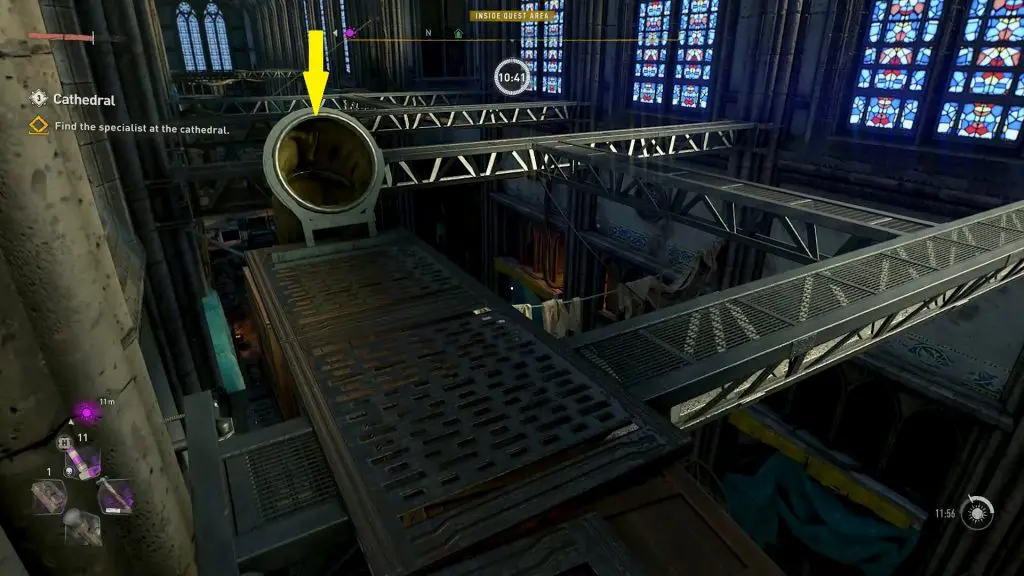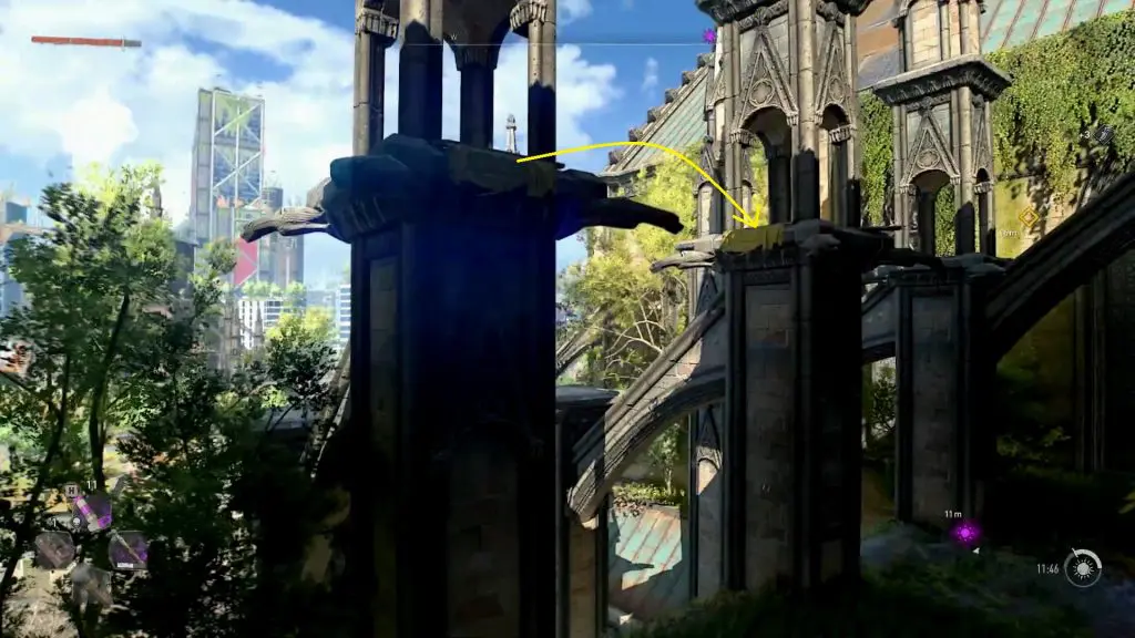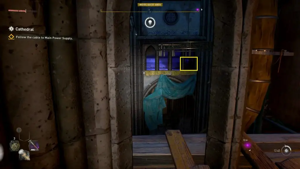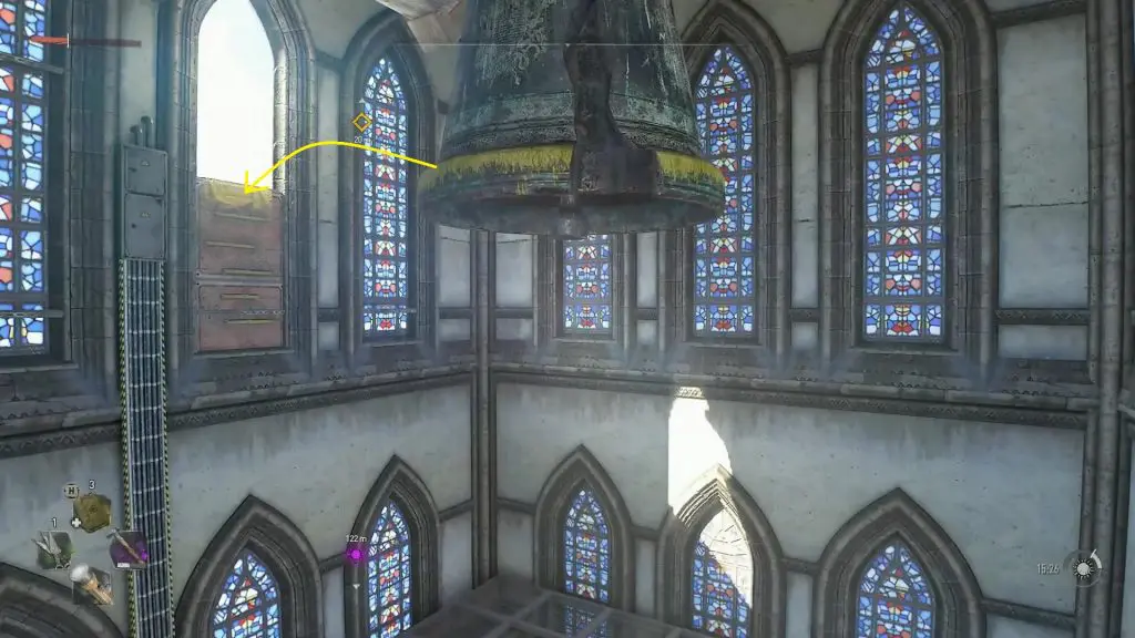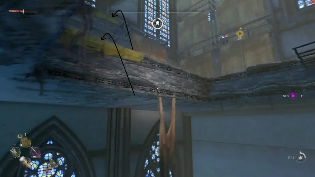 You will need to enter the cathedral through a broken window marked by the objective market. Climb up the platforms as shown below to reach the upper level where the broken window is.