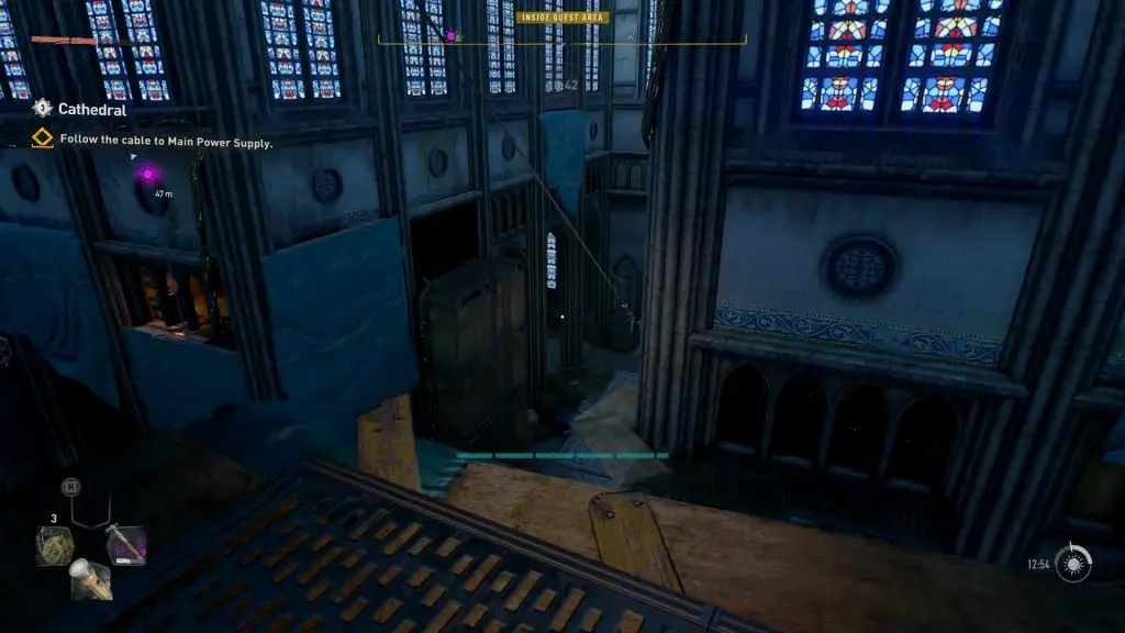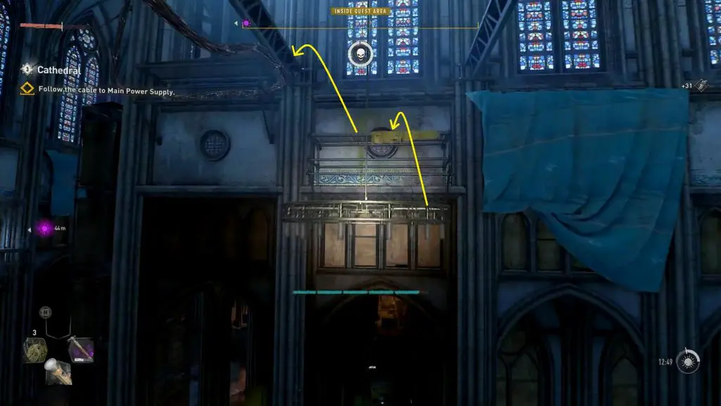 Now follow the electrified cable again. Squeeze through the wooden planks blocking your path to reach another chandelier. The final generator is on the floor behind the chandelier, as marked by a yellow square in the picture below. Jump on the Chandelier and go to the other side and pull out the cable from the generator. This will complete the objective.