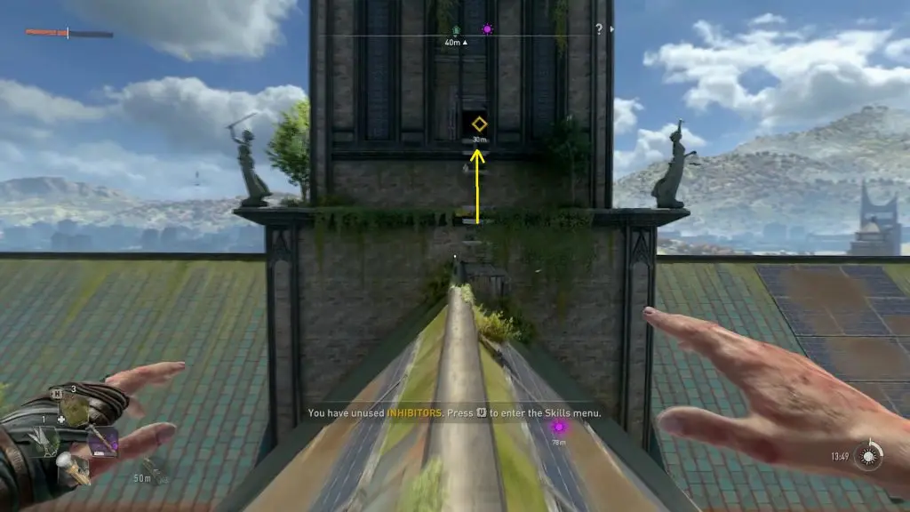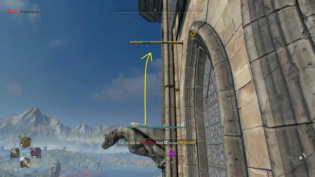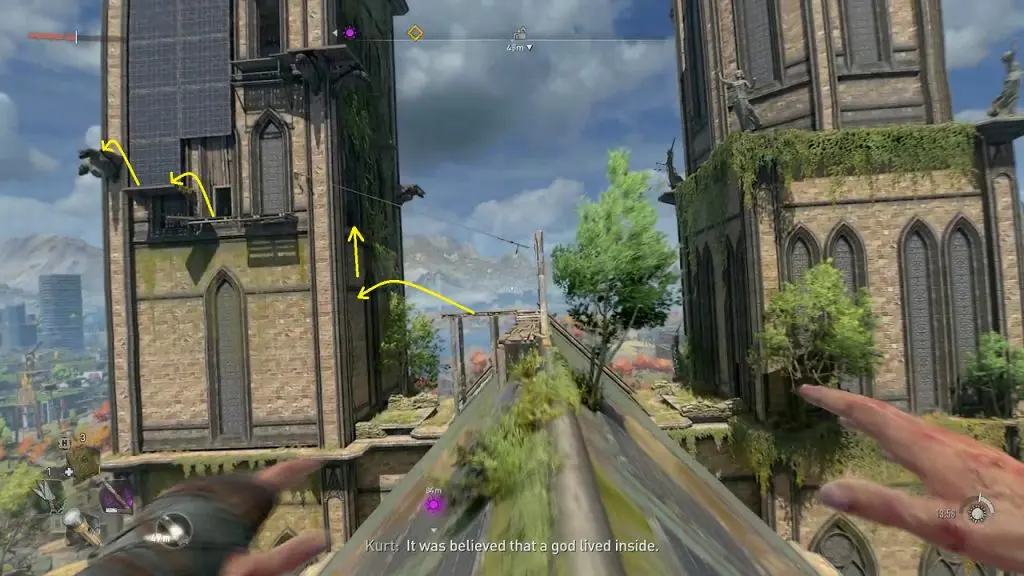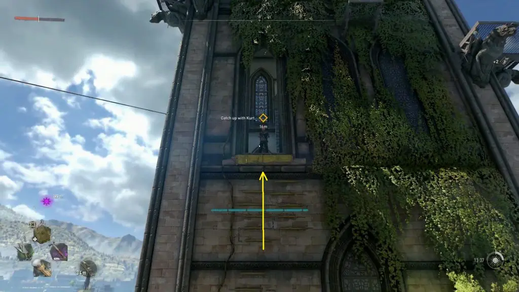 After the cutscene, exit the tower and go back to the location where you got punched by Kurt by following the path shown in the picture below. After reaching the location where you got punched, turn right and climb up the platform and then climb up the statue in front of it as shown below.