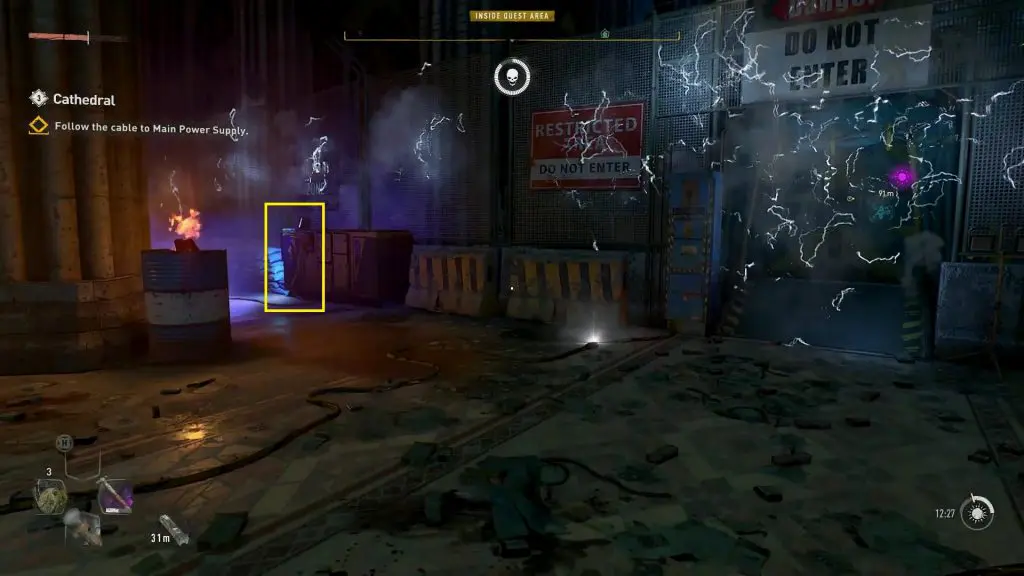 Follow the electrified cable and it will lead you to the electrified entrance. On the left side of the electrified entrance, you will see a generator as shown in the picture below. Pull out the cable from the generator to de-electrify the path.