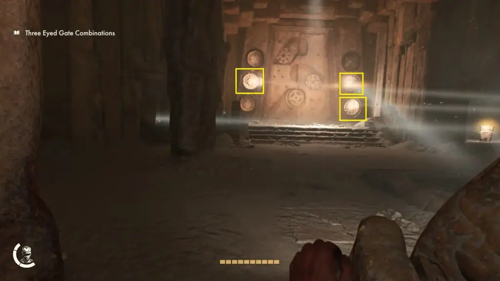 Now return to the main room to finally solve the puzzle to open the Three-Eyed Gate. Follow the given order: Left Mirror: Central Mirror: Right Mirror