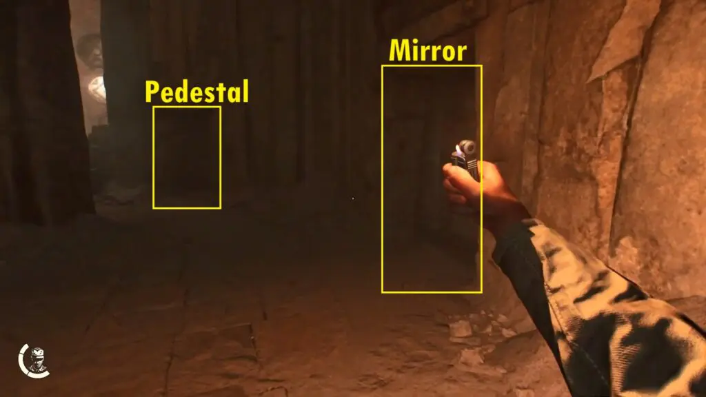 There are two doors on the right side of the main hall. Now, go through the first opened door on your right in the main hall to find a mirror on the floor. ( In the same room, you’ll notice an empty panel, but you don’t need to place the mirror there.)