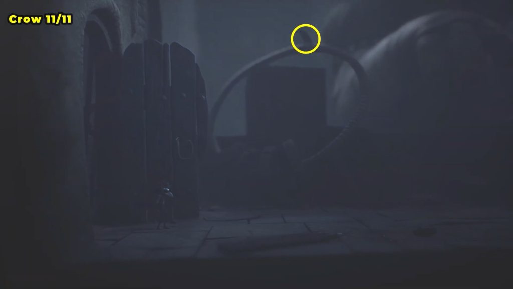 Right after the big baby grabs you, you’ll drop down into a dark area. Head right and exit the room through the window. Continue forward, go down the spiral stairs, and leave the building. You’ll find the final crow perched on the giant ring.
