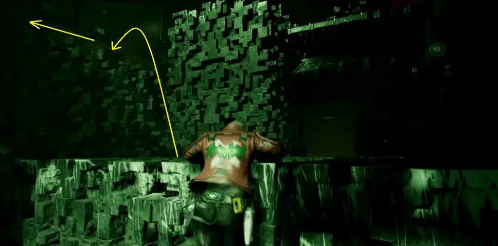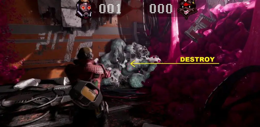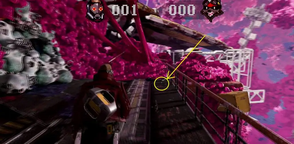 After learning the quick reload ability from the first weapon upgrade bench, drop down and fight the enemies. Then proceed on the only path. Jump up and then turn around to find some goo as shown in the second picture below. Destroy the goo to uncover the Guardian Collectible underneath it.
