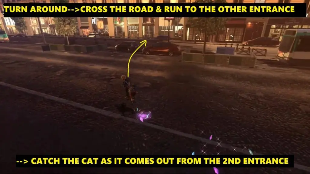NOTE: Approach the cat. As soon as the cat enters the metro –> turn around and quickly cross the road to reach the 2nd metro entrance –> catch the cat when it exits from the 2nd entrance.