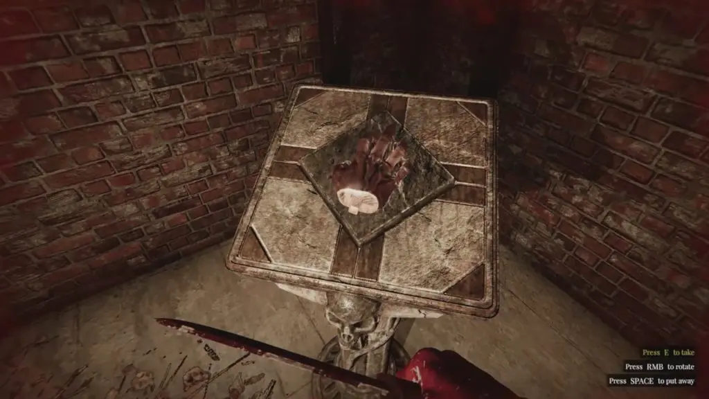 2. Go to Area3 and use the key to open the door (with the bones-symbol). Collect the human hand from the heap of corpses.
