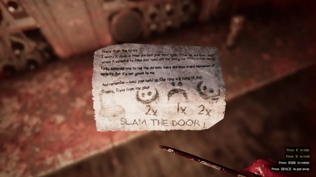 1. Go to the control room of Area2 and collect the key (open two doors with bones-symbol) and note.
