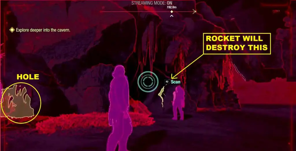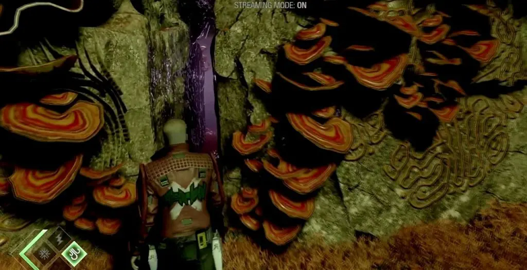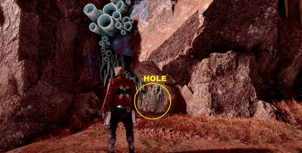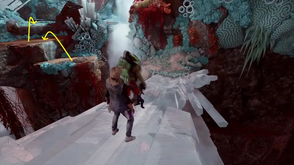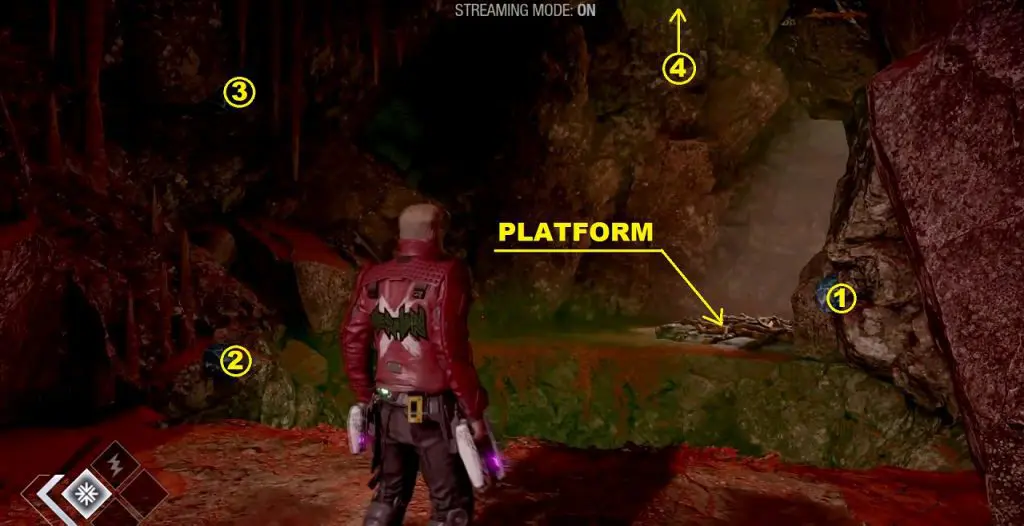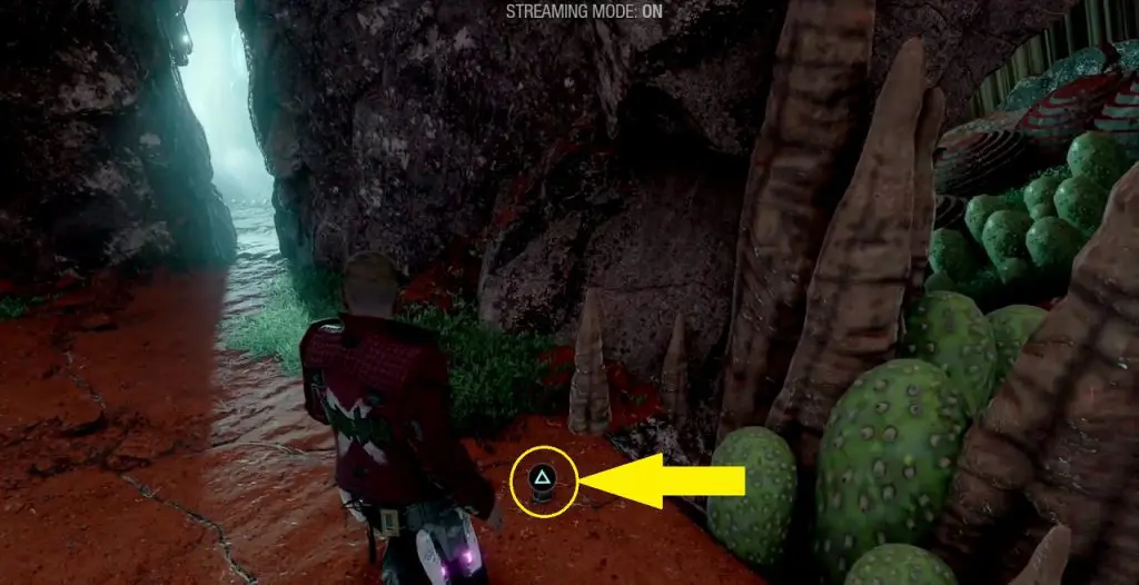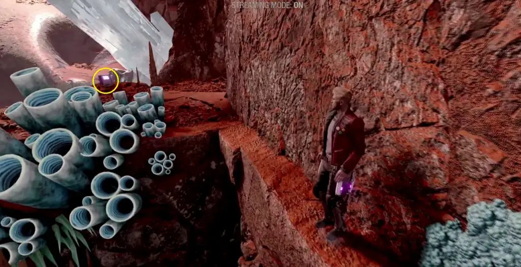 After defeating Ogrode, you can see a small hole on the mountain wall on the right side as shown below. Send Rocket through the small hole. Rocket will destroy the structural weakness on the mountain wall on the right side of the hole as shown in the second picture below. This will reveal a small crack on the wall behind it. Squeeze through the wall to reach an area with toxic gas. Shoot the 4 gas leak points with your ice blasters as shown in the third picture below. This will remove the toxic gas. Then jump across and stand on the platform on the opposite side as shown in the third picture below. Now command Groot to raise the platform. This will take you to the upper level. Then move ahead and climb the rock on the right side. Go till the end and climb another rock on the right side. Then walk through the ledge to reach the outfit at shown in the fourth picture below.
