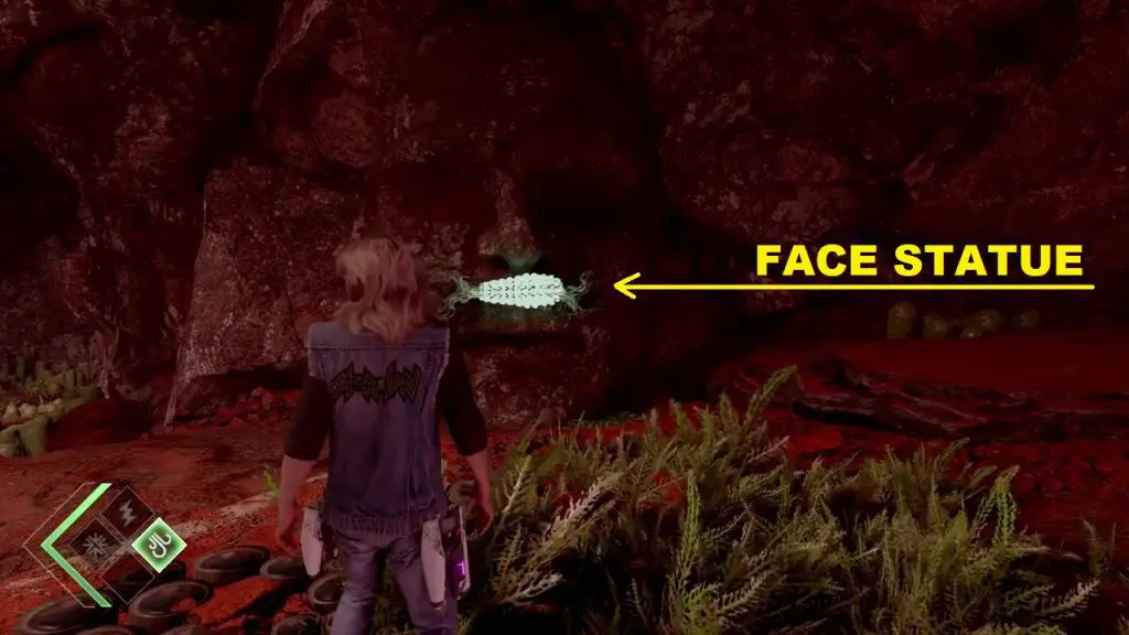 After the 2nd Ogrode Fight, Use your Wind Element to move the face statue as shown in the picture below. Moving the statue will reveal some goo behind it. Destroy the goo to reveal a hole in the mountain wall. Crouch through the hole to reach an area with toxic gas. Shoot the gas leak points with your ice blasters to remove the toxic gas. Then pull another statue using your Wind Element as shown in the second picture below. Then jump across and go to the end of the cliff to find the Guardian Collectible lying on the ground as shown in the third picture below.