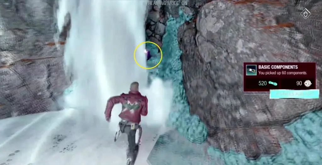 During this chapter, you will come across a dark cave in which Groot will light the path for you. Stick to the right side cave wall and eventually, you will reach a thin gap on the wall with purple light coming through it as shown below. Squeeze through the gap to reach the purple box containing the outfit.