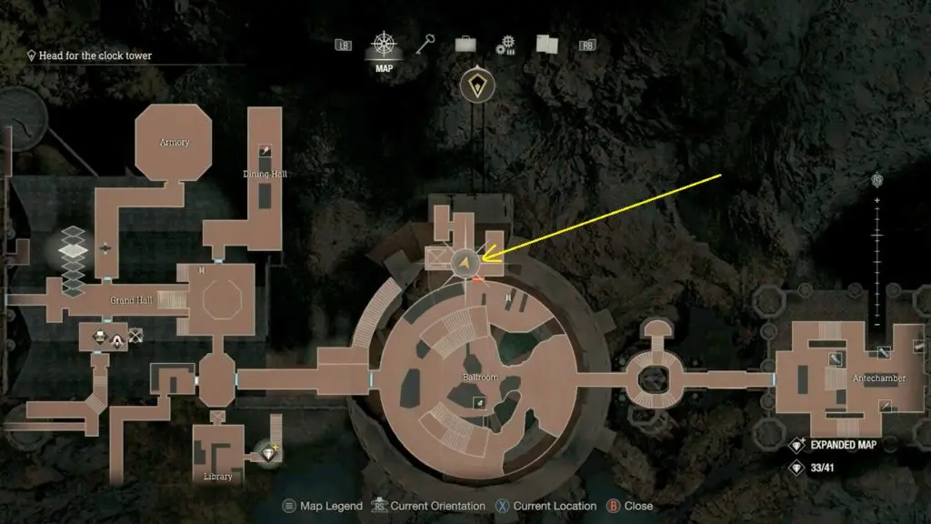 Once the chapter begins, ride the elevator to return to the castle. Upon reaching the top of the elevator, you will arrive in the room to the north of the ballroom, where a gondola can take you to the clock tower. Board the gondola to cross over to the clock tower and proceed to enter it.