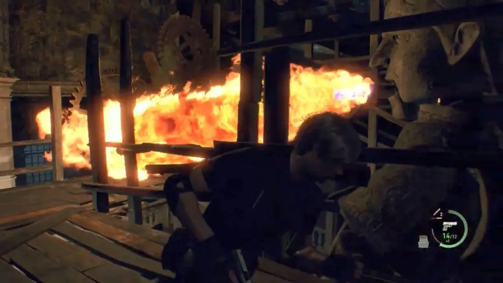 After the cutscene in the clock tower, start fighting the enemies and climbing the stairs. During the following two segments where you need to evade the fire-breathing statue while finding your path through Scaffolding, wait for it to approach and come to a halt before swiftly crossing its path to ensure the flames are trailing behind you.