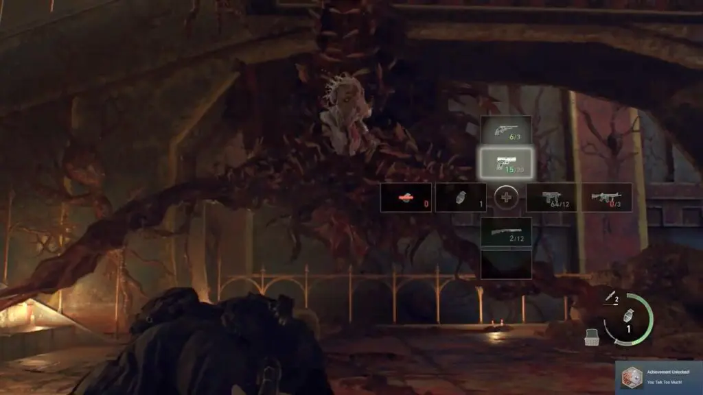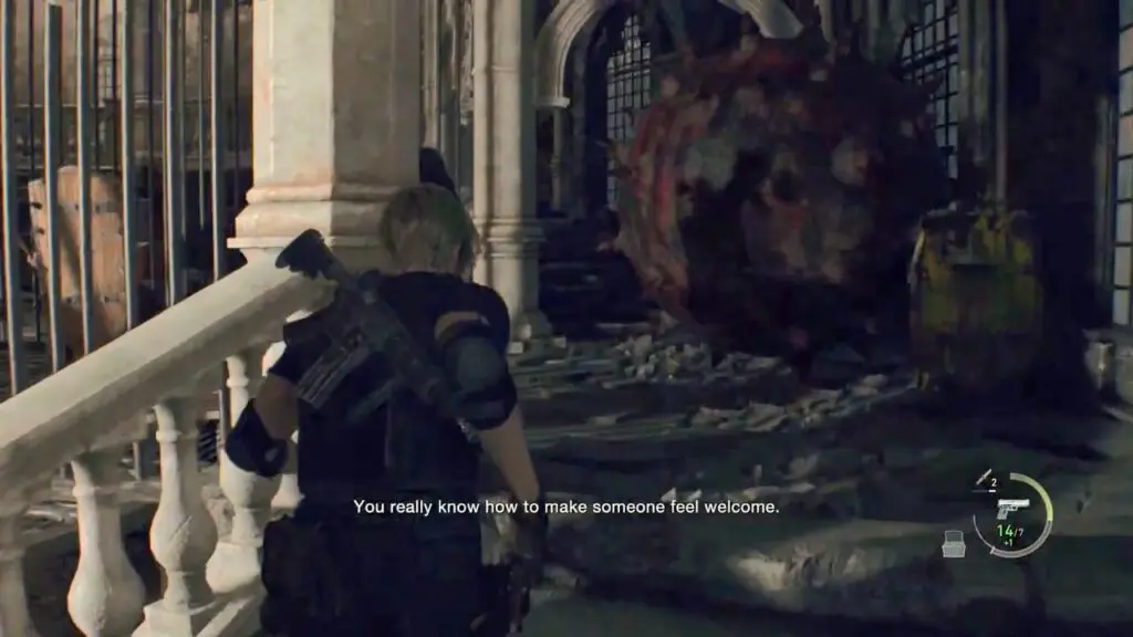 Initiate the battle against Ramón Salazar while he’s in a mutated form. To inflict damage, aim for his exposed mouth (human body) using firearms or engage in melee combat when he falls to the ground. Salazar moves around the room with his tentacles and unleashes attacks such as shooting goo, dropping explosive goo on the ground, and attempting to slam into you. These attacks can be evaded by maintaining distance from Salazar and using parts of the arena as cover when he’s about to strike.