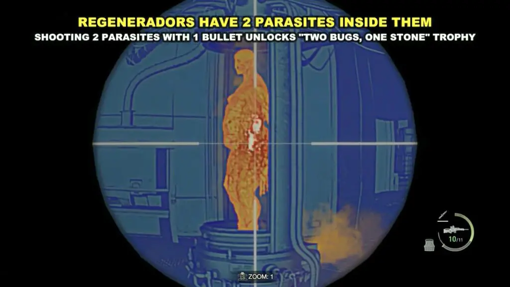 Add a sniper rifle to your inventory and combine it with the Biosensor. Using the Biosensor, aim your gun at the Regenerators in the tanks and locate the one with two Parasites arranged in a row.