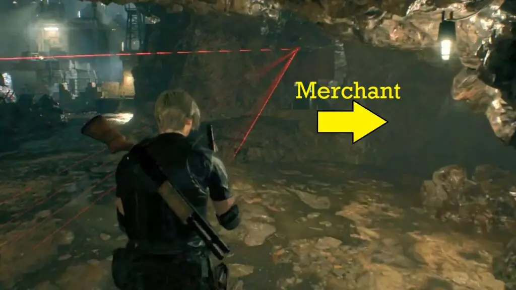 Follow the path located to the left of the merchant, which leads you to the back of the laser machine turret-1. Interact with it from behind to either move it or disable it, enabling you to proceed past the obstacle.