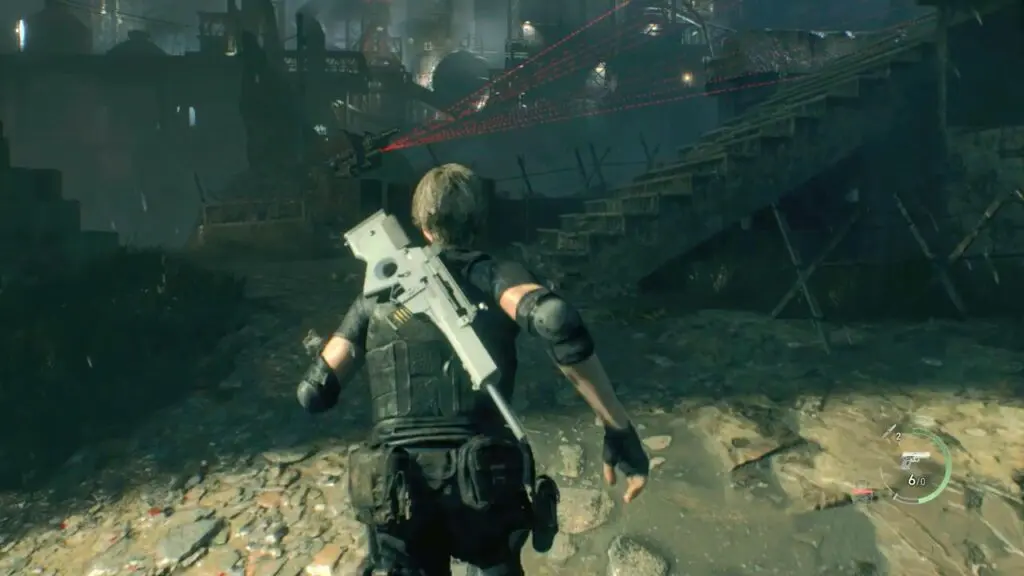 Upon entering the area, an alarm will trigger, and multiple enemies will start chasing you. Station yourself in front of the window of the building to your right to take down a significant number of enemies as they converge on you.