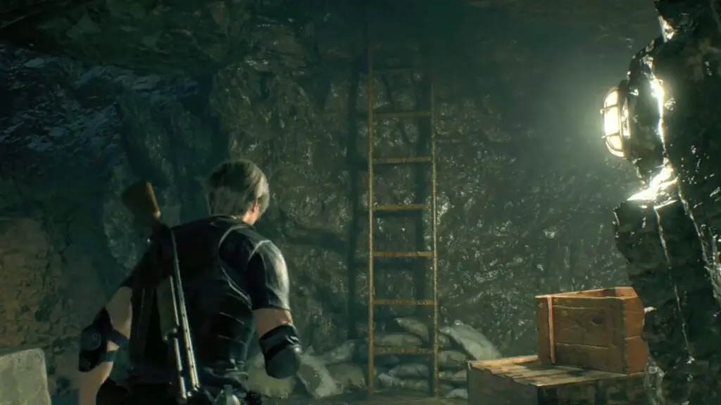 Now that both turrets have been repositioned to face away from the direction you’re heading, ascend the stairs to advance to the next area. Keep following the path ahead until you reach the end of the cave, where you’ll need to climb the ladder.