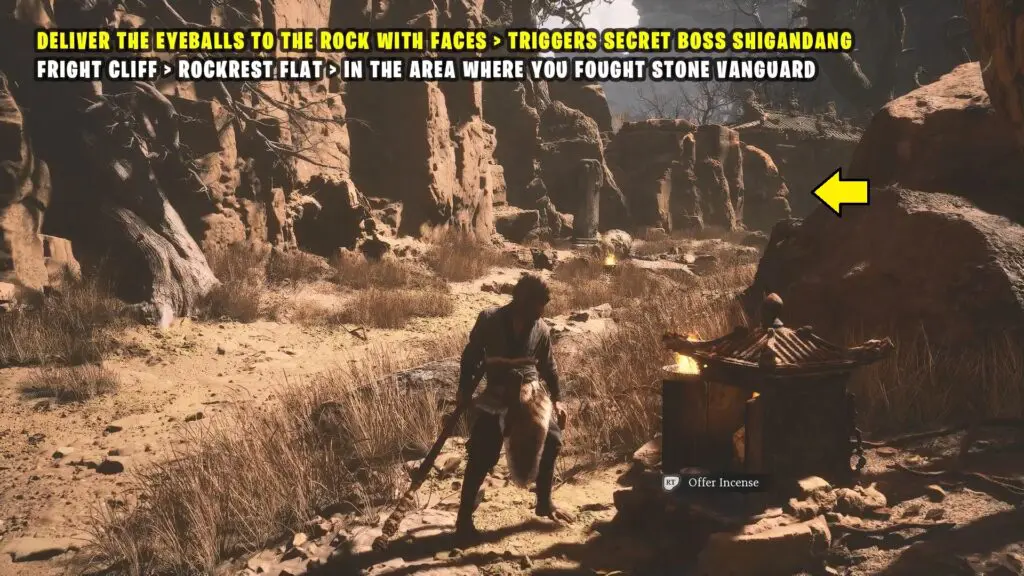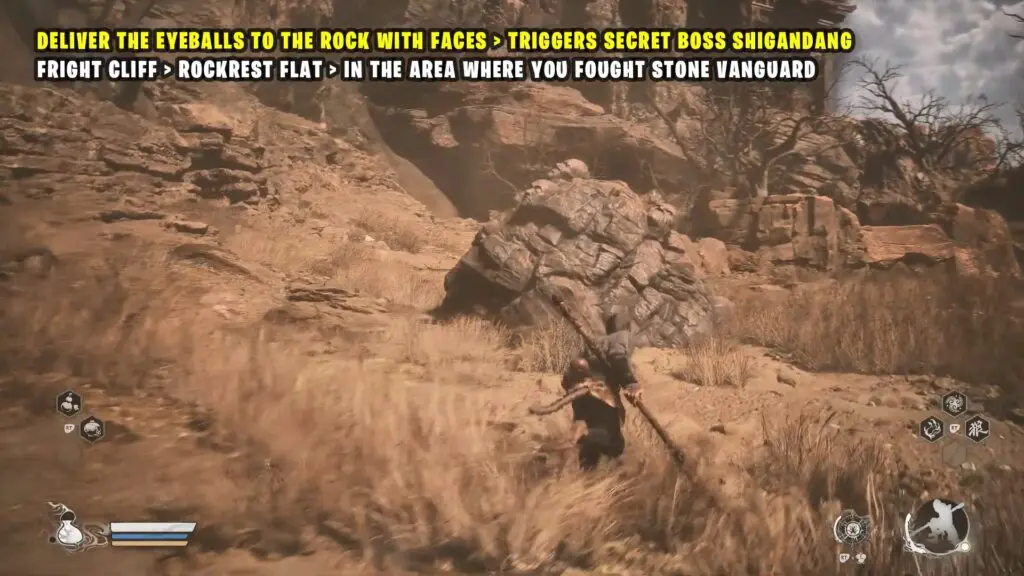 Inside, you’ll find a large rock with multiple faces on it. Place the Buddha’s Eyeballs here to begin the boss fight with Shigandang.
