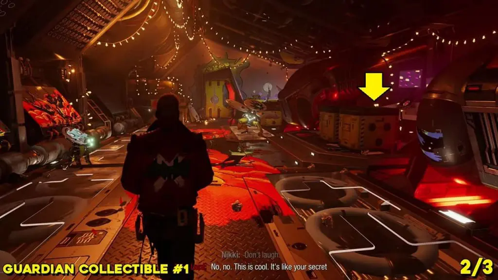 You will find Guardian Collectible after reaching Nikki’s secret hideout. On the right, you will see a few pink colored-monitors. I have attached a screenshot for reference. Guardian Collectible is lying on the ground behind yellow crates in front of pink colored-monitors