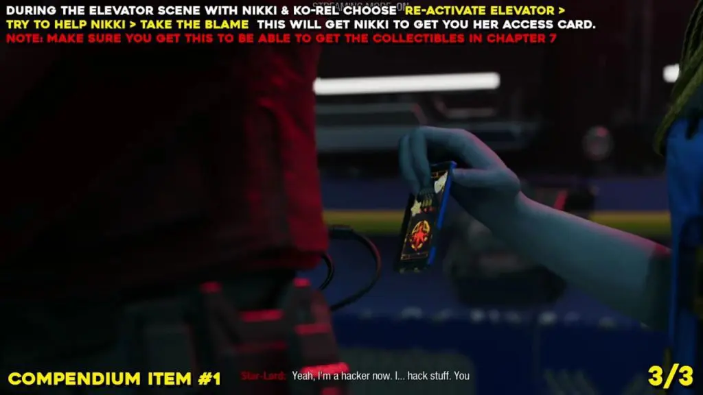 To get compendium, you must always side with Nikki during the elevator ride with Ko-Rel. Do not back up Ko-Rel here! This will earn Nikki’s trust, and she will give you her Personal Device to unlock doors on this level.