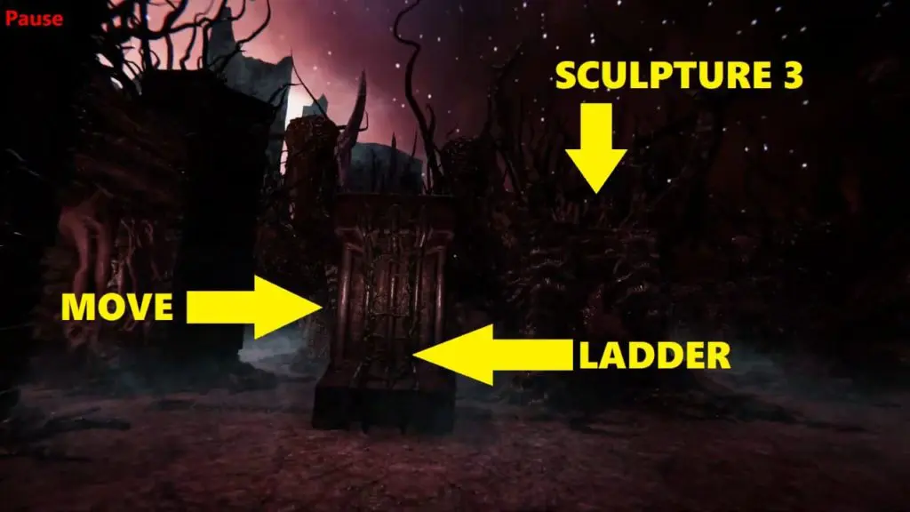 STEP 5: Third sculpture is at the top of the platform. Use the handle of the movable pillar to move it again to the new position. Climb the ladder to retrieve the 3rd sculpture.