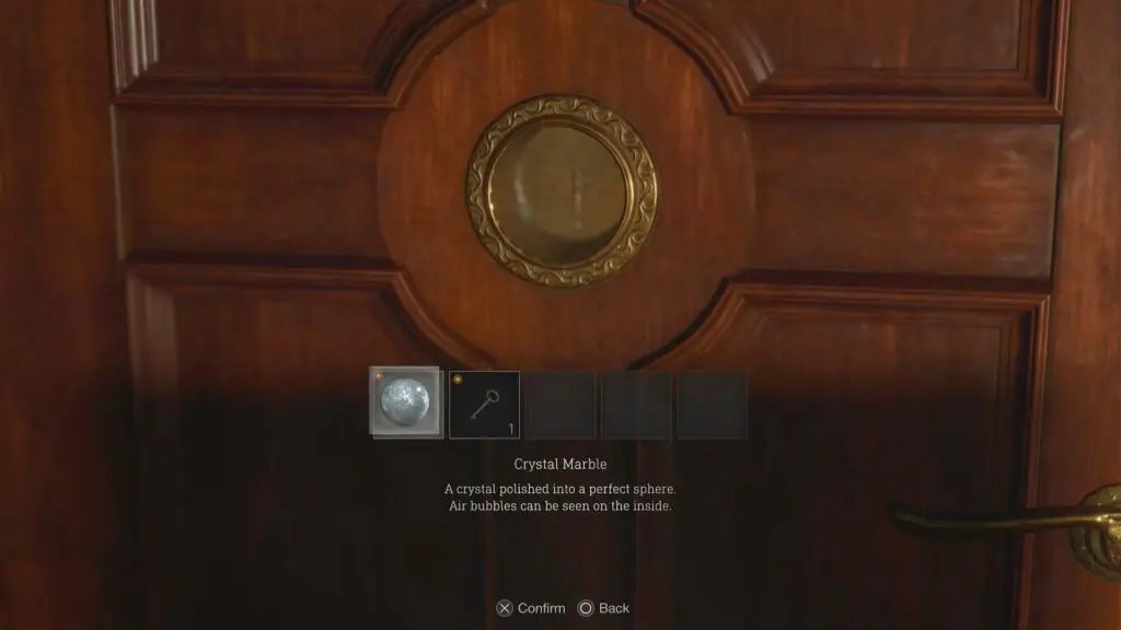 Bring the Crystal Marble to the locked door upstairs and insert it into the designated slot. Then rotate the small orbs until they match the insignia. Here a player needs to turn the ball so that the bubbles inside the orb line up with the symbol behind them.