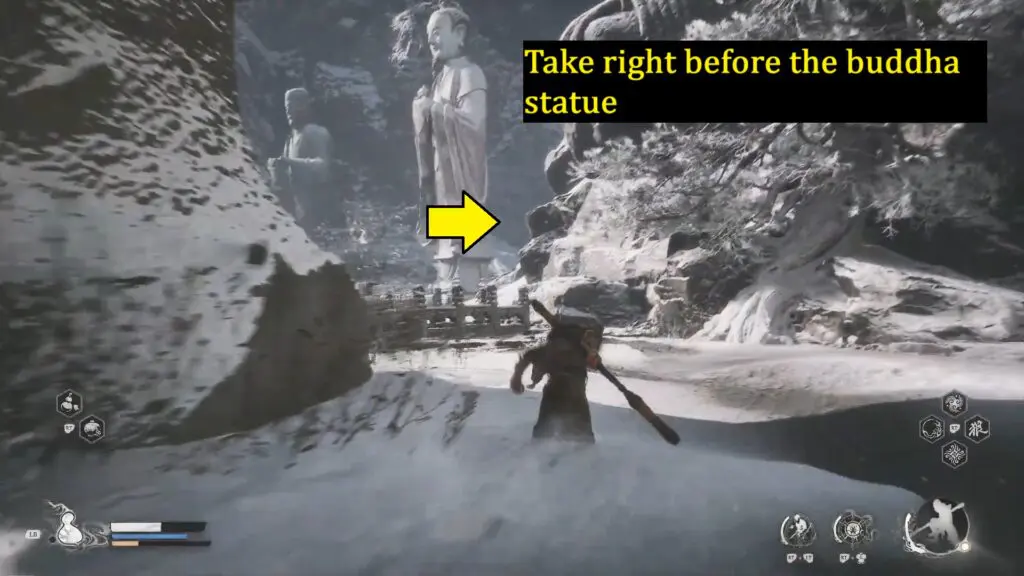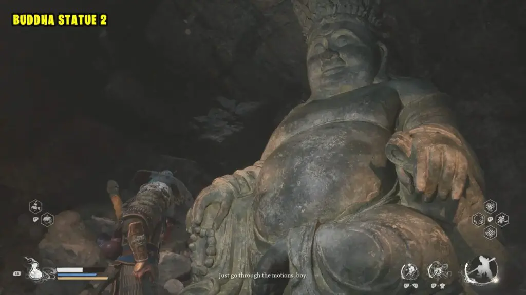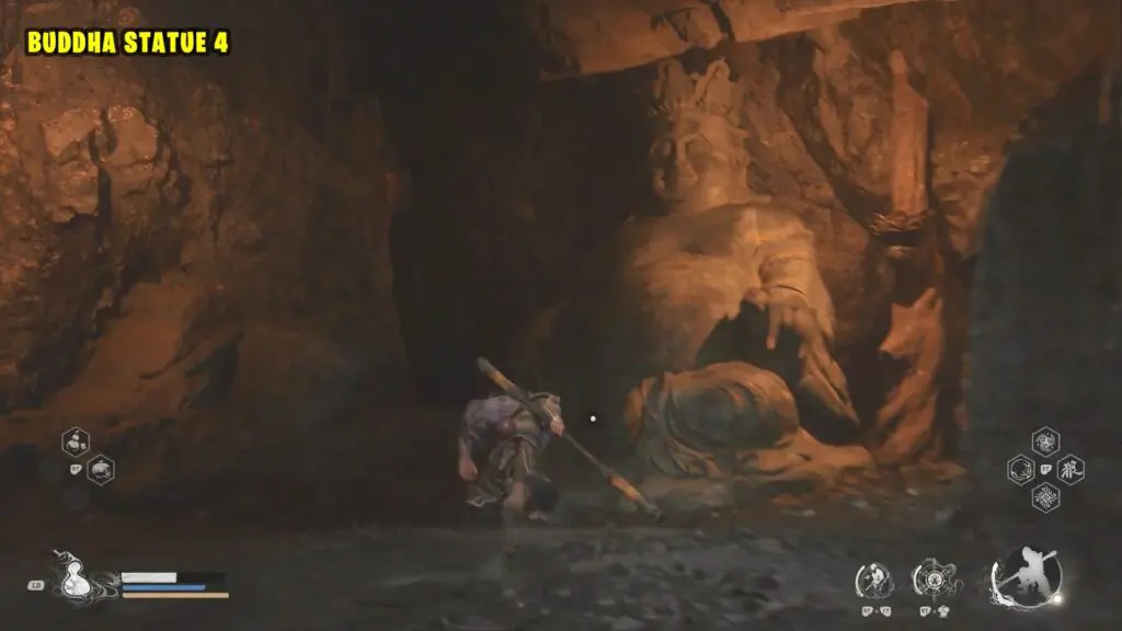 Go down the stairs to the left of the previous statue. The next Buddha statue is on the right side at the bottom of the stairs.