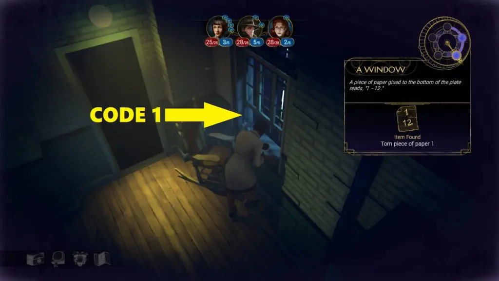 1. The first part of the code is written on a torn piece of paper which is glued on the window at the end of the corridor. Code: “1 12”