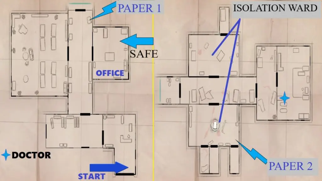 • Search the isolation cell for the information: Now one of the isolation wards is unlocked. Fight with possessed guard and possessed patients. collect the safe code 2nd paper clue here from a dead body.