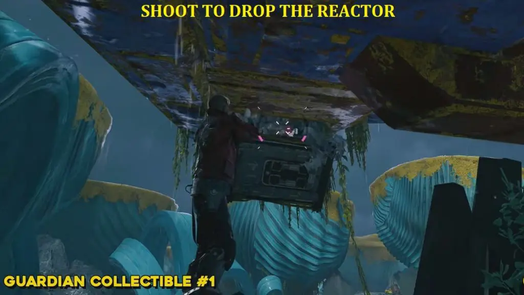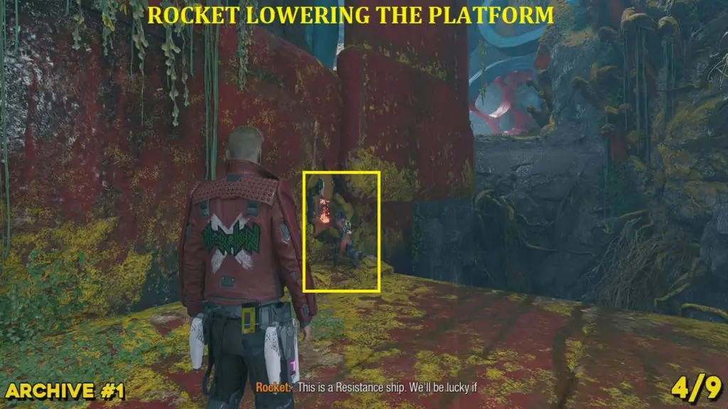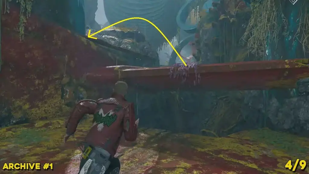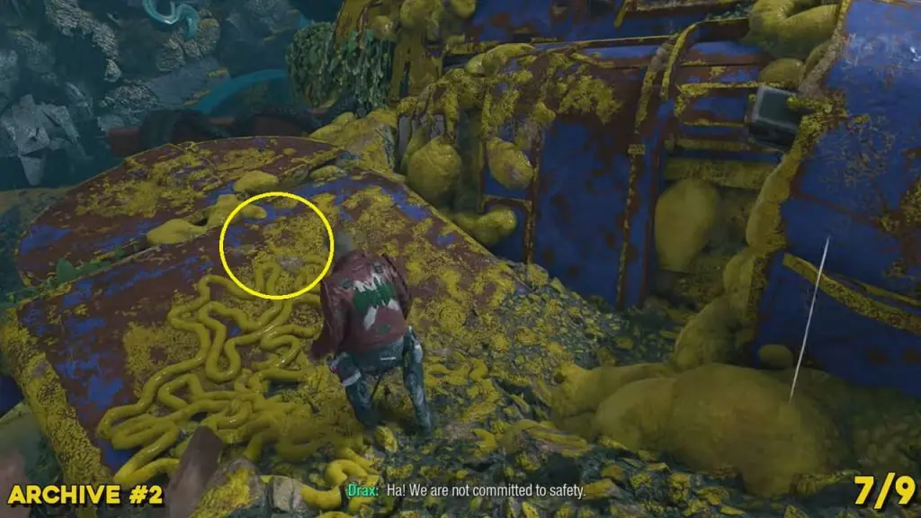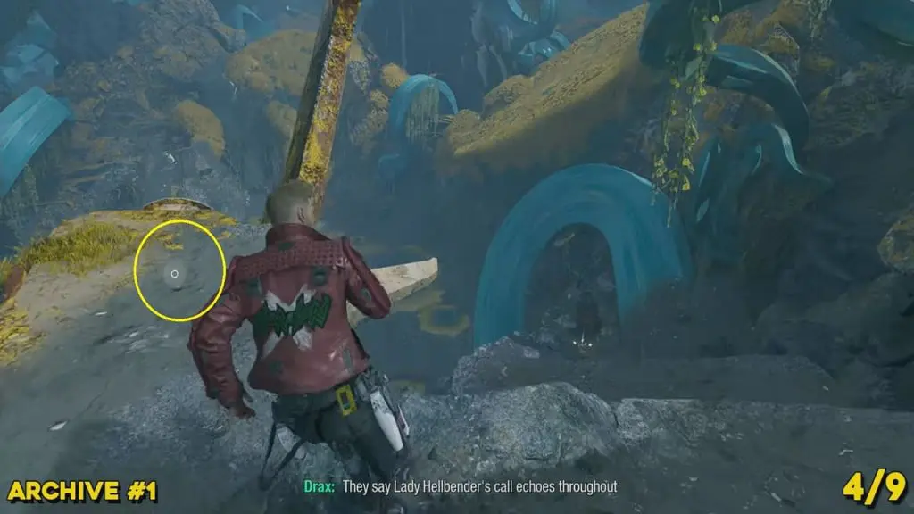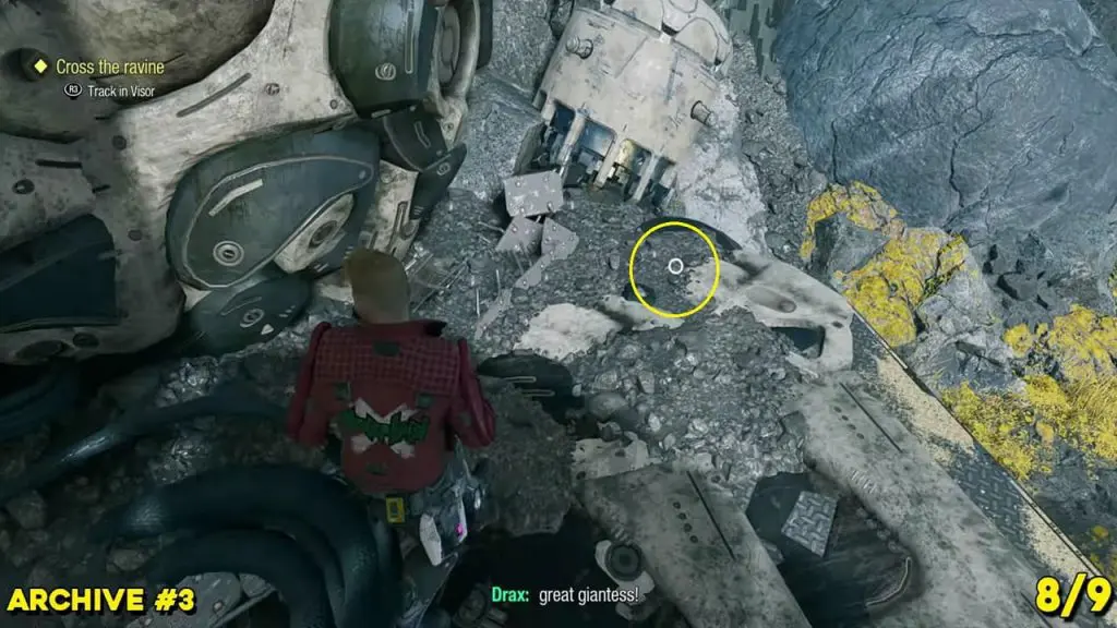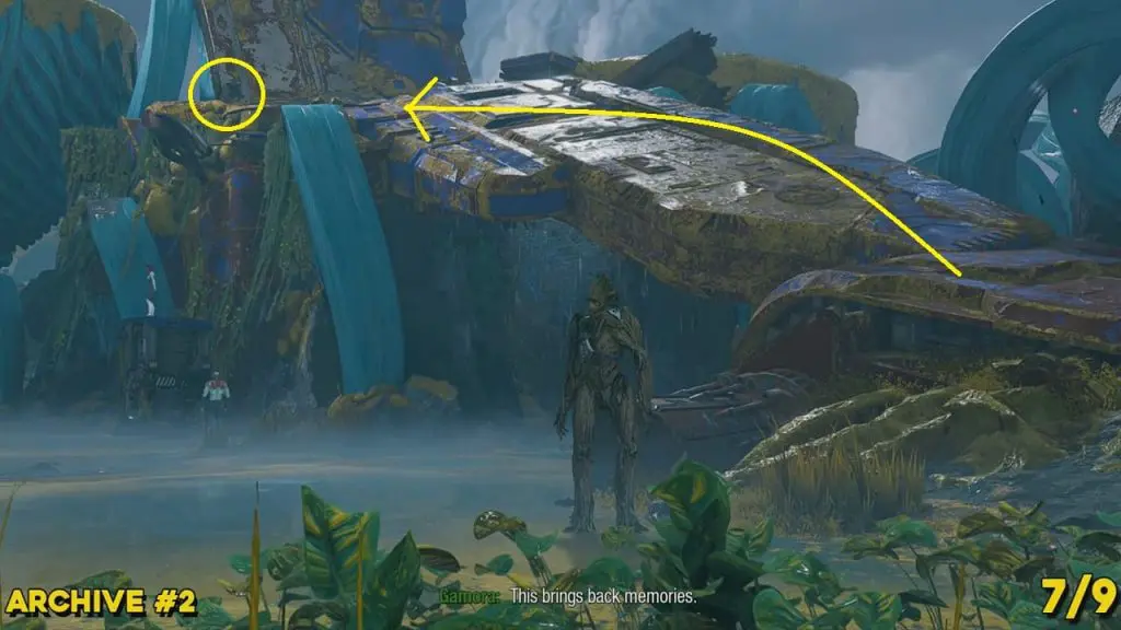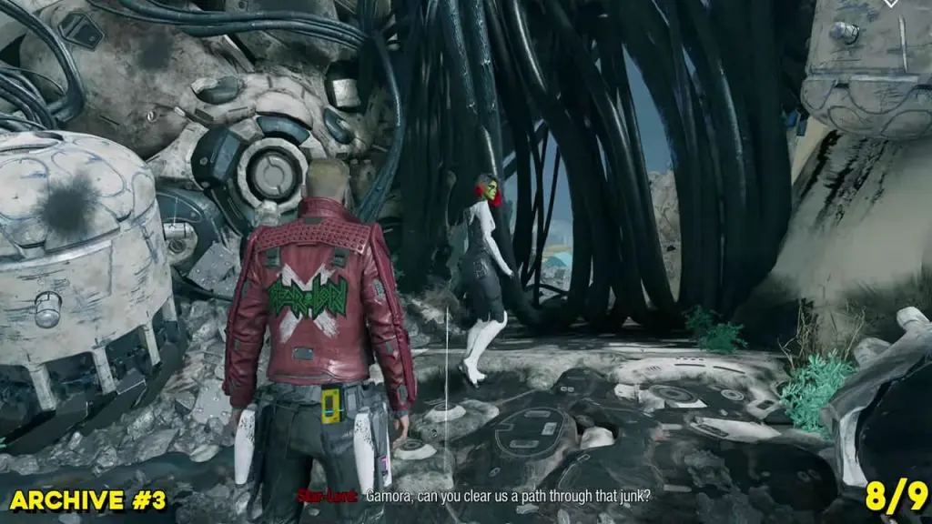 From the previous collectible’s location, reunite with the other Guardians. Now, command Drax to put the reactor on the left side (blue outline for where the pillar should go), and then tell Gamora to cut the cables above the spaceship (outlined yellow in Visor Vision). This will cause the spaceship’s wing to fall to the ground. Walk up to the left side of the wing to find the archive. It is directly above where you told Gamora to cut the cable.